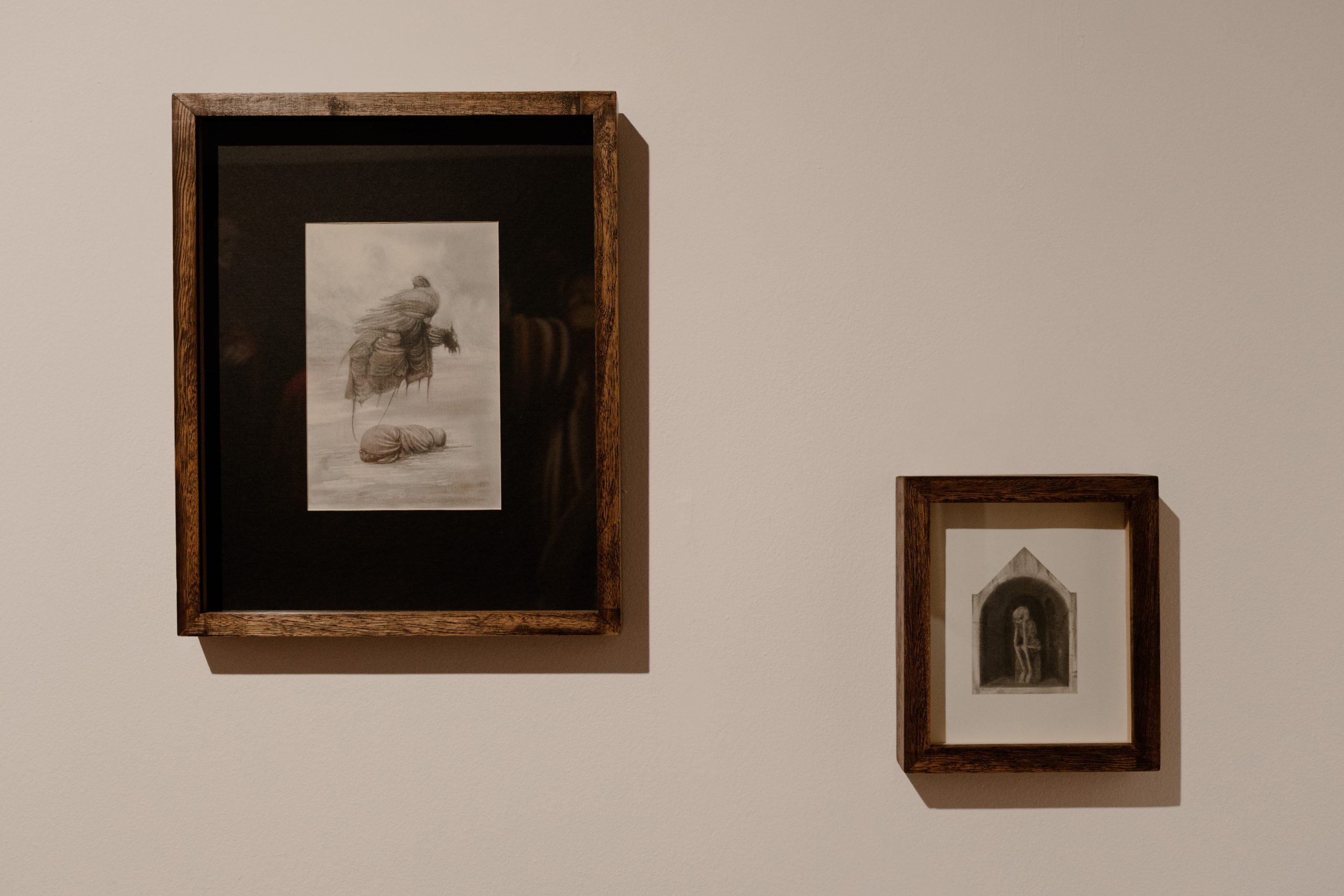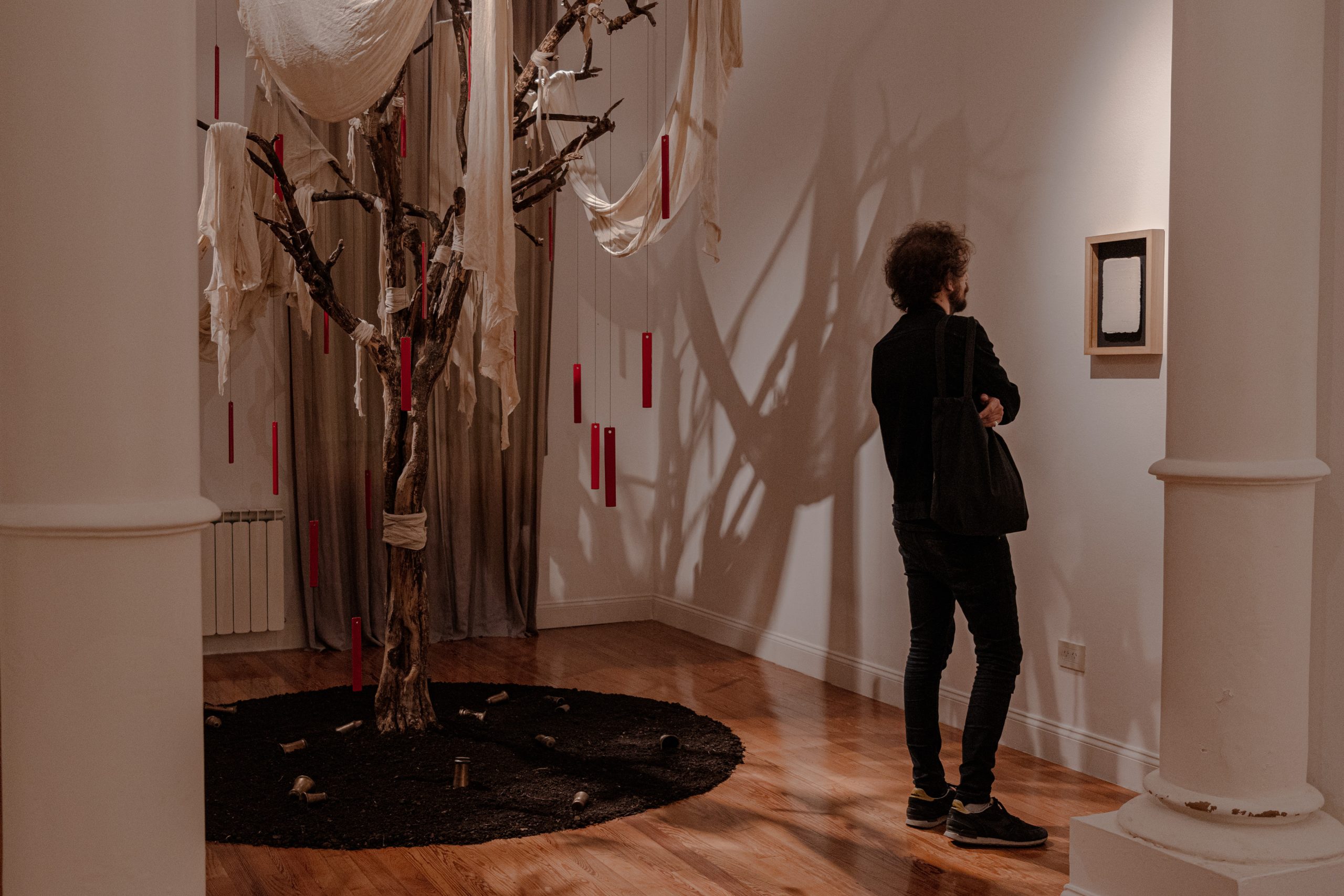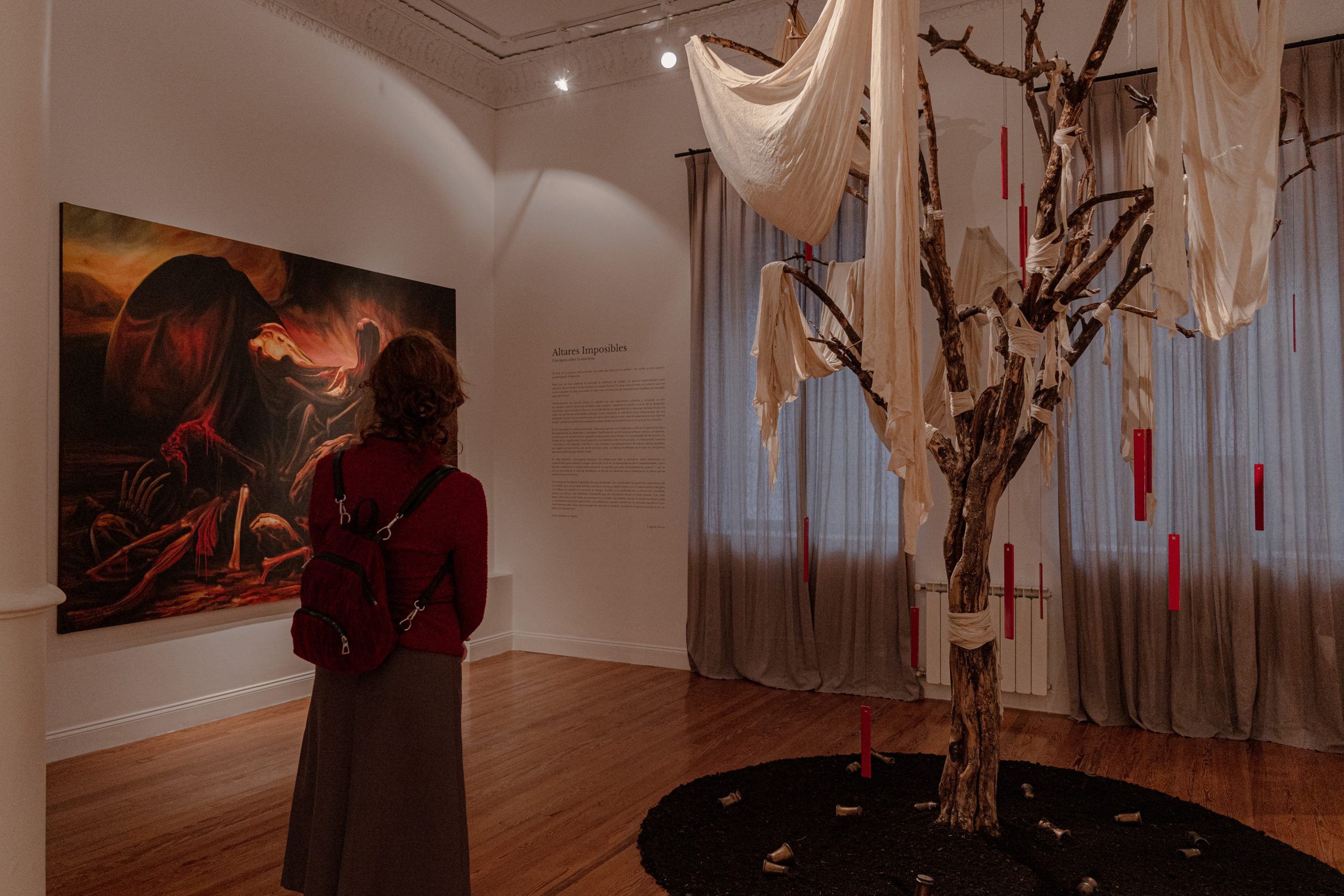 Son entonces los altares imposibles los que consienten con complicidad los gualichos caprichosos de un chamán que, en su hacer artístico, escribe e inscribe su diario mágico. En el umbral entre lo tangible y lo etéreo, su práctica se convierte en liturgia. Sumido en lo profundo de un trance casi inevitable ensaya una danza, una dramática coreografía que por momentos evoca un ritual fúnebre. Con cada trazo, cada línea y cada forma, se sumerge en un estado casi extático, donde el tiempo se diluye y deja un testimonio visceral de que el dolor y la celebración pueden coexistir en un delicado equilibrio. Es un ritual desesperado, claro, pero que permite abordar lo inasible, reconstruir el espacio que ahora es una falta y no dejarse morir.