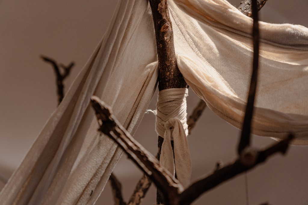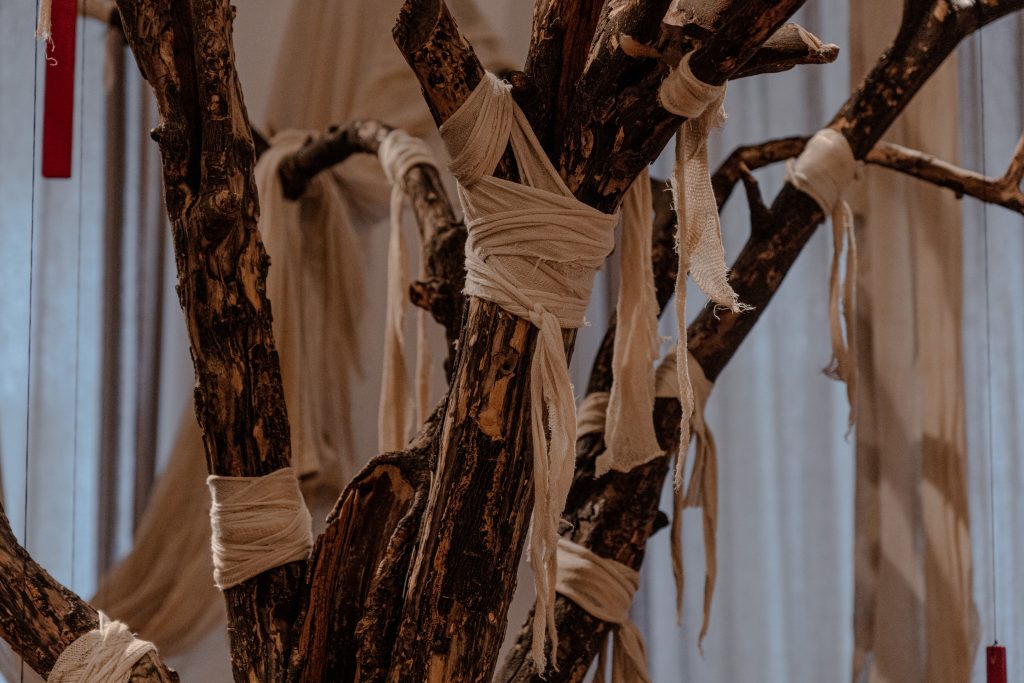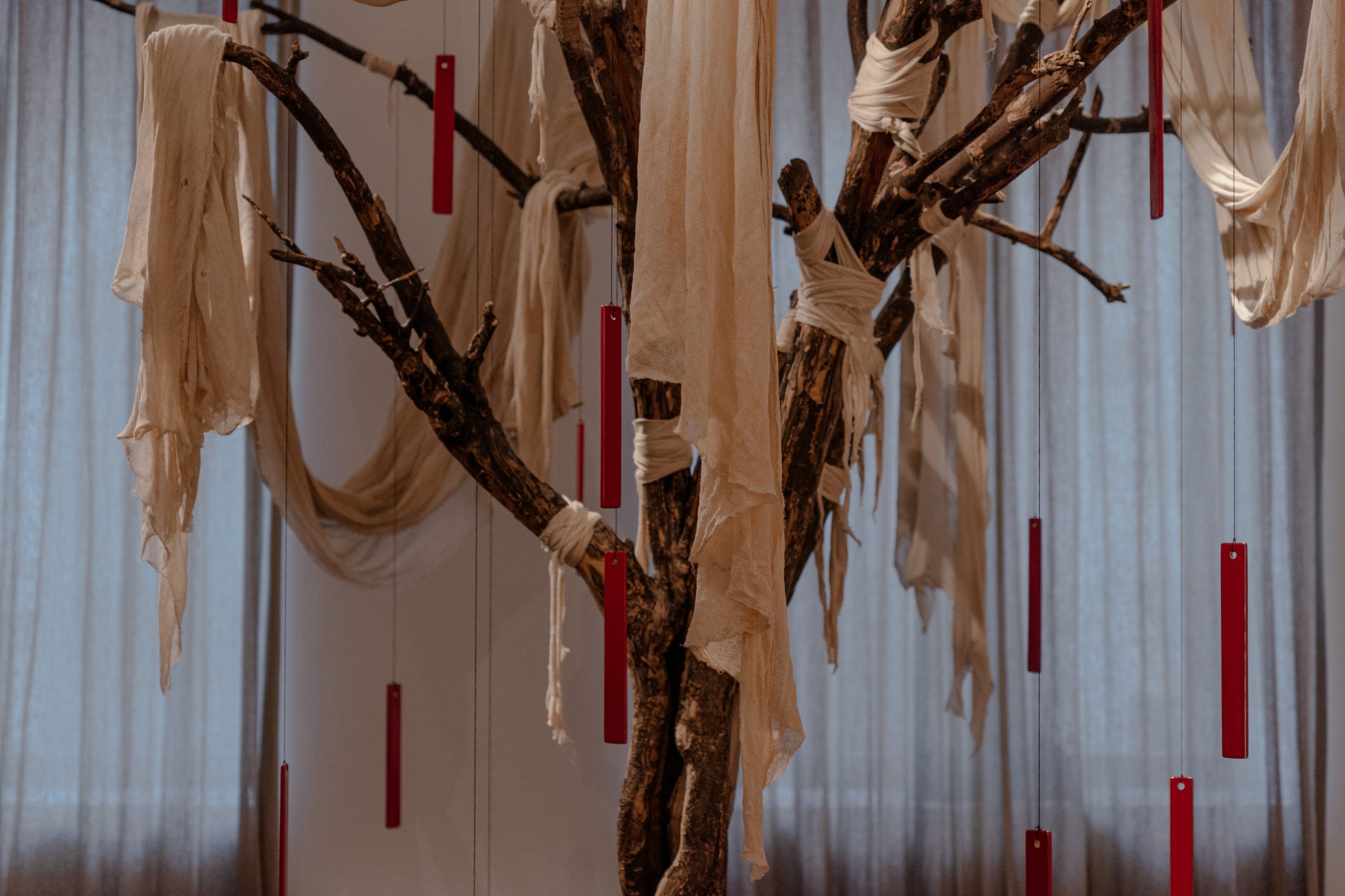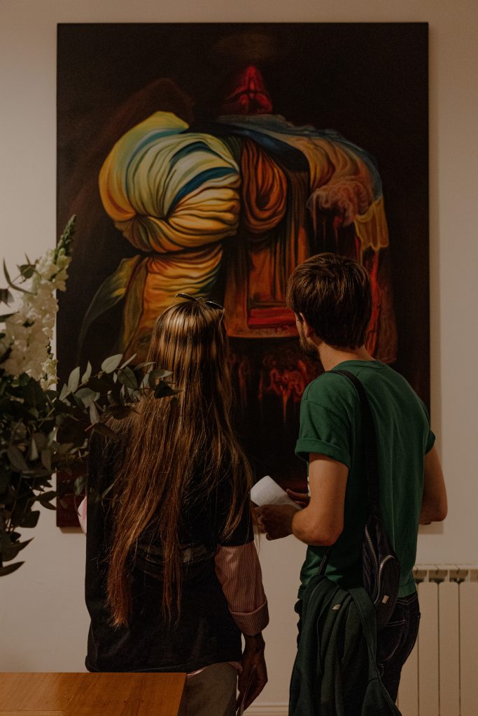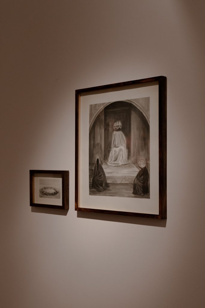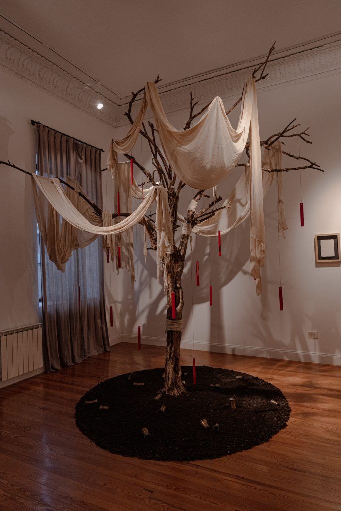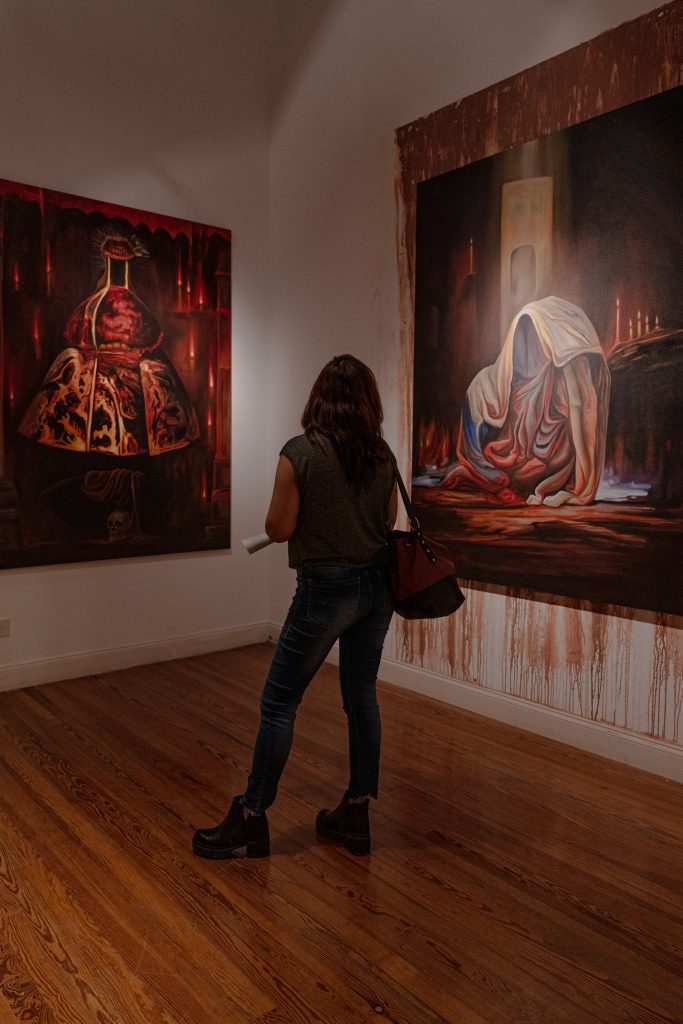 En esta arbitraria cosmogonía personal, las voluptuosas telas y suntuosos trajes transmutan su materialidad para volverse la imagen de lo que no se ve, la representación de lo irrepresentable. Como lápidas, evidencian la insoportable presencia de aquello que está inexorablemente ausente. Y así, su arte se convierte en un acto de resistencia, un intento de mantener viva la memoria en un lienzo que se transforma en invocación.